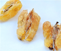 质量简介:含潮大约5%,多为联体;干透的多为散碎颗粒状,品相不好。含微量蛤蟆籽或血管,蛤蟆皮,水发前后膨胀25-30倍,呈雪白半透明的糕状。