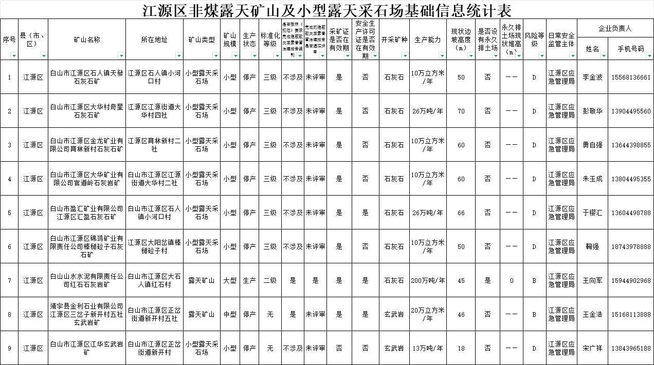 江源区非煤露天矿山及小型露天采石场基础信息统计表