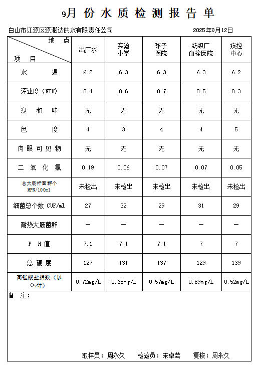 9月份水质检测报告单